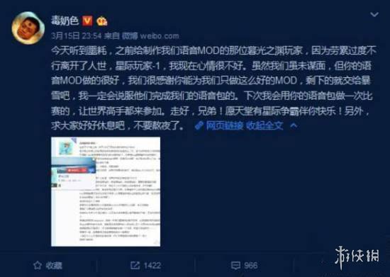 2017年3月,《星际争霸2》国服语言MOD的作者“暮光之渊”被曝出因过度疲劳而逝世,黄旭东听闻暮光之渊死讯时哀伤不已,后在微博发了一条悼念的消息,众多游戏界大佬也纷纷表示自己的哀悼之情。
