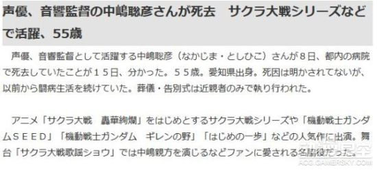 日本声优中岛聪彦于9月8日去世,享年55岁,他去世的消息直到15日得到才公开。中岛聪彦的死因并没有得到公开,但据报道在他去世之前一直过着与病魔做作斗争的生活,最终他没能战胜病魔,年仅55岁就离世,十分令人惋惜。目前中岛聪彦的葬礼和告别仪式已由其亲属举行。