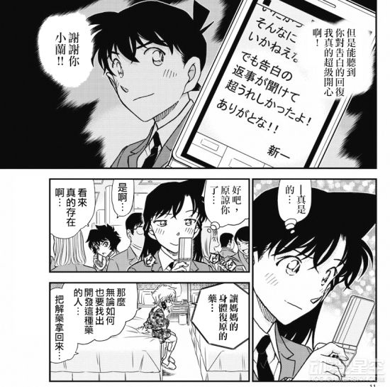 这时候新一给小兰发了短信,表示能够收到告白回复十分开心。而世良正在给她妈妈打电话,说一定要找到开发这种药的人,并且拿到解药,四处躲藏的日子。而服部平次在看到工藤和小兰的事情之后,也开始考虑如何向和叶告白。