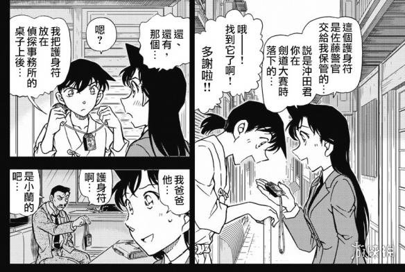 小兰告诉园子她去找冲田君是为了归还给他的护身符,而且告诉他,因毛利小五郎以为这个护身符是小兰的,所以打开看了。