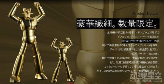 日本经典机器人动画《魔神Z》在最近一段时间也是非常的活跃,在《魔神Z》推出的45周年里,官方宣布了多个新企划,《魔神Z》的新剧场版将于2018年1月上映。日前为了纪念《魔神Z》作品诞生45周年以及作者永井豪先生入行五十周年,《魔神Z》官方和KOUGEI工艺进行合作推出了纯金版本和铂金版本的的魔神Z模型,其中纯金版本的大尺寸魔神Z模型全球限量只有五个。