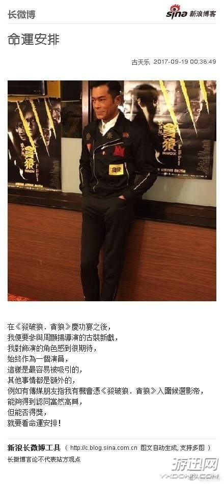 此前有爆料称古天乐将扮演电影中的吕布,而今天,古天乐也发微博称在《杀破狼:贪狼》庆功宴之后,便要参与周显扬导演的古装新戏,对新角色很期待。周显扬转发了古天乐的微博,并表示这是一次“很兴奋的合作,帅出天际的吕将军。不一样的古天乐!”算是正式确认了古天乐出演吕布的消息。