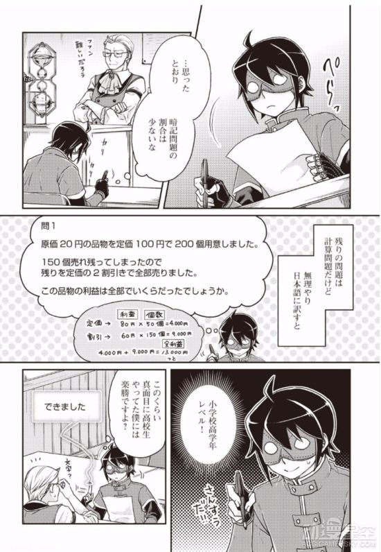 比如下面的这篇漫画。因故来到异世界的男主角参加了商会举办的考试,上面的题目为“原价20日元的商品现以100日元出售,共计200件。在剩余150件时打8折,直到全部卖完。提问:商家从这批商品中获取的利益是多少”。对于熟悉小学高年级数学加减乘除四则运算的读者来说,稍一动脑便可以得出结论为13000日元,男主角确实也是这么想的,而当他做完这道题准备交卷时,出人意料的状况发生了——