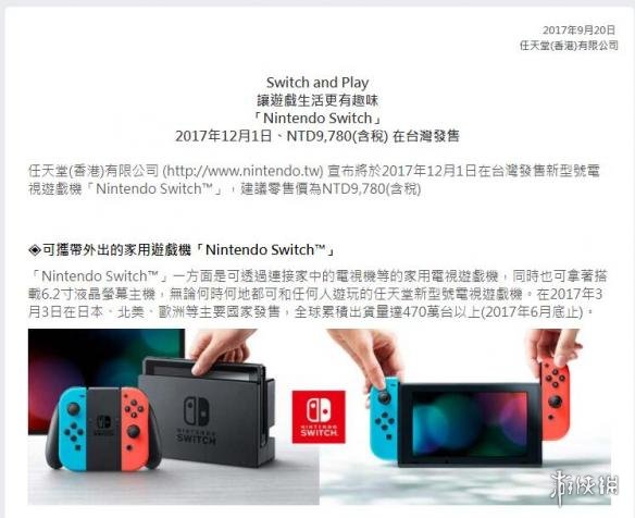 据任天堂香港官方消息,Switch将于2017年12月1日在中国台湾地区正式发售,建议零售价为9780新台币,约合人民币2133元。之前的首发价格是300美元,约合RMB 1970元。