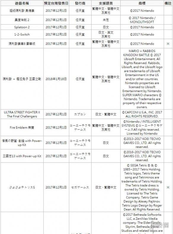 台湾地区首发游戏包括《超级马里奥:奥德赛》(支持繁中和简中),《异度之刃2》,《喷射战士2》,《马里奥赛车豪华版》(支持繁中和简中)等游戏。