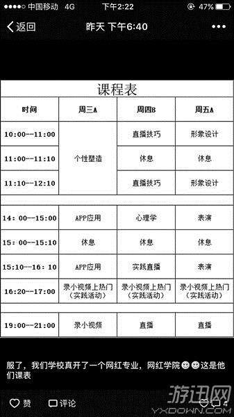 我们了解到,与重庆工程学院开设的“网红学院”培训的企业为重庆谬音文化传播有限公司。该公司成立于今年 1 月,经营范围为组织文化交流活动、承办展览服务活动、文化艺术表演策划。关于“网红学院”一事,该公司相关负责人介绍,目前与学校合作开设的定向班,培养的网红主要是为了直播、电商和短视频三个方向。除了吸收定向学校的学生之外,社会人员也可以报考与教学内容相同的培训班,培训三个月收费 3980 元。而在朋友圈内已经有人曝光了“网红学院”的课程表。