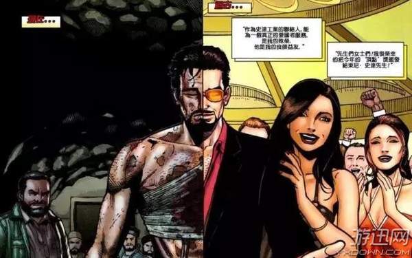 在漫威漫画《我是钢铁侠》中,直接采用了左右对比的方式,左边是绑架的画面、右边是之前的奢华生活。左右拼接,托尼斯塔克站在中间。这种落差表现更加突出,效果其实比电影里的还要好。