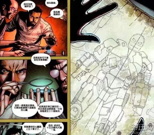 在漫威漫画《我是钢铁侠》里,这张MK1设计图纸则出现的比较突兀。相比较来说,电影里的还是更真实。