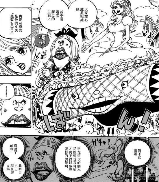 考虑到山治的特殊立场,布琳让厨师们依序进入点心工场,自己则利用能力抽取了他们的记忆,让这些人误认为山治已经和布琳结为夫妻。解决了后顾之忧,山治从飞毯里跳了出来,他居然仅凭嗅觉就能猜到蛋糕的造型和使用的材料……