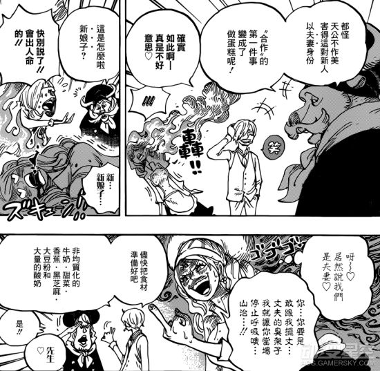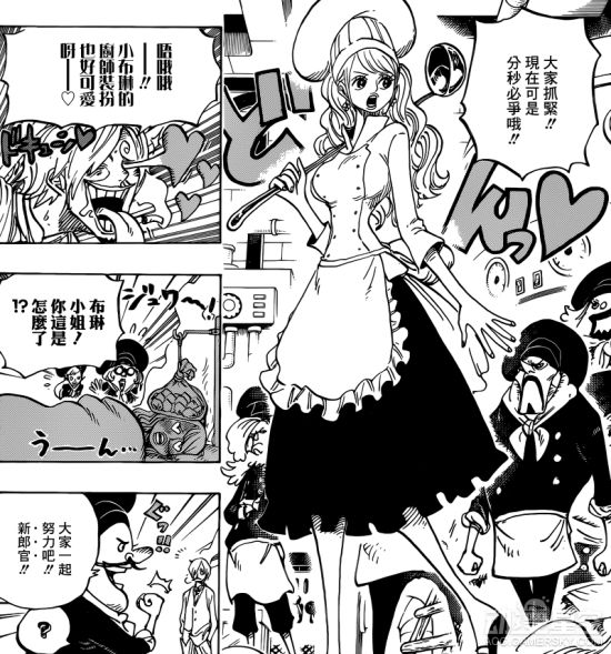 经过一些爆笑的小插曲,戚风、山治和布琳的结婚蛋糕制作正式开工。对于他们来说,时间就是生命,稍有耽搁的话同伴们就会葬身大海,然而此时桑尼号和镜世界里的战况已经岌岌可危——