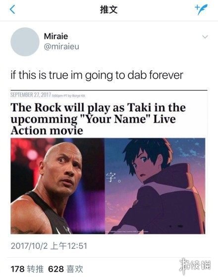 不过近日又有Twitter上的消息称道恩·强森将在好莱坞真人版《你的名字》中饰演男主立花泷。