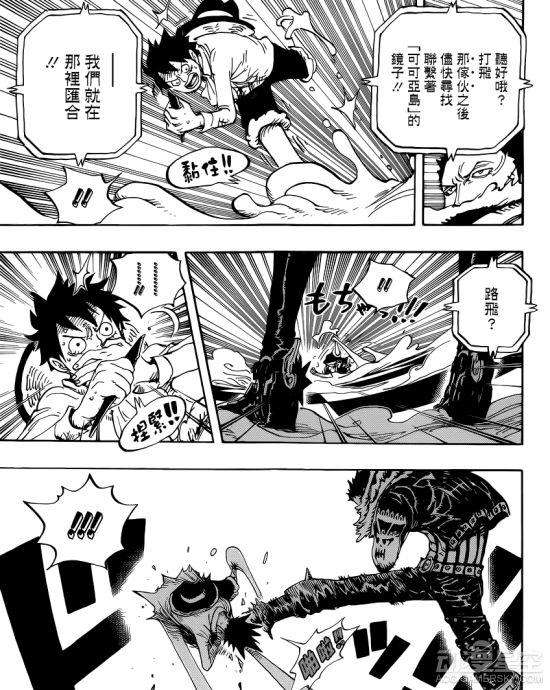 娜美让大家打碎了镜中世界通往船上的镜子,并且通过镜子碎片告诉路飞他们平安无事。这时候卡塔库栗展开了攻击,为了保持和娜美他们的通信不被中断,路飞将镜子的碎片含在嘴里,忍受着卡塔库栗的暴揍。