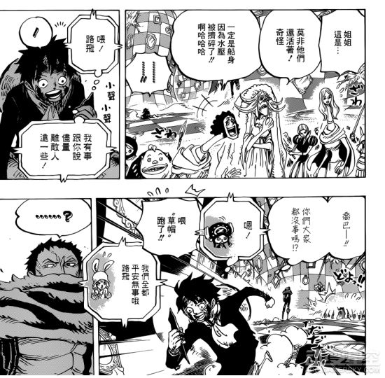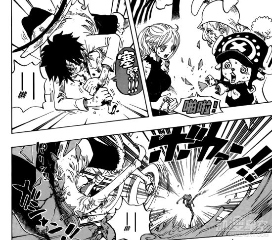 《海贼王》漫画881话汉化版公开,在本集中甚平和路飞为了让大家能够顺利逃脱也是各显其能。甚平操纵着尼桑号冲向巨大的海浪,利用“GREEN ROOM”带领大家顺利逃生,佩罗佩罗斯还以为他们都已经死了。而路飞为了不让镜中世界的大妈海贼团众人知道娜美、甚平他们平安无事,一直忍受着卡塔库栗的暴打。