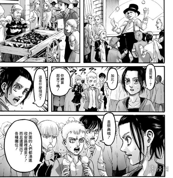 马莱帝国在艾尔迪亚人的隔离区中开启了“祭典”活动,从来没有见过这些的孩子们都玩疯了。莱纳也是跟着他们到处付钱,感觉他虽然无奈但也是非常开心。在“宣告”举行之前,法尔可带莱纳去了一间地下室,在那里等待他的是4年未见的艾伦。