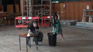 将一瓶液氮盖上盖子放进盛有温水的垃圾桶内,然后倒进1500个乒乓球。当液氮受热急剧沸腾后发生猛烈爆炸,乒乓球漫天飞舞