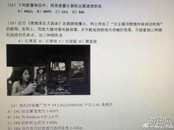 而这道考题是游戏求生游戏爆火,网上传出了“女主播用物理外挂成功吃鸡”新闻(传送门),实际上用放大镜对着电脑屏幕并不能提升游戏内倍镜的效果,只能看到三种组成的色彩点,那么这三种颜色是什么?而题目的配图则是涵涵直播时的画面。各位看官们,你们会这道题吗?欢迎在评论中解释交流。