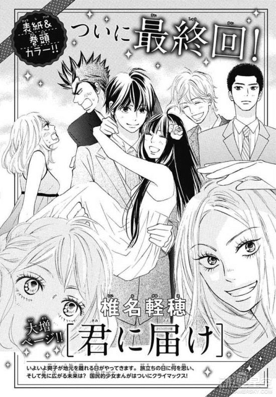 而在漫画最终话的预告图上,本作主要角色们纷纷亮相,与读者们作最后的告别。画面中央,身穿礼服的翔太用公主抱的姿势将爽子抱在胸前,预示了这对情侣的结婚结局,点燃起读者的少女心。
