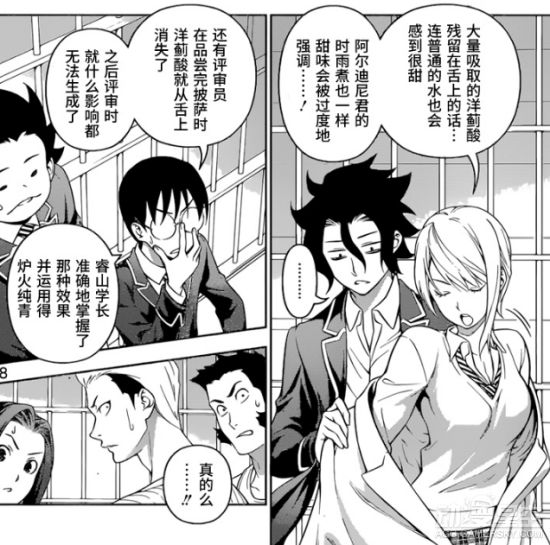根据场外两位学霸的解说,睿山的牛肉洋蓟通过改变评委们舌头的味觉而对接下来的料理进行干扰,并且还不会影响到在此之后自己队友的料理体验。能如此炉火纯青地运用食材的特性做到这一点,睿山“炼金术士”的称号绝对当之无愧。另一边,身处牢笼的爱丽丝与黑木场无形地又秀了一把恩爱。