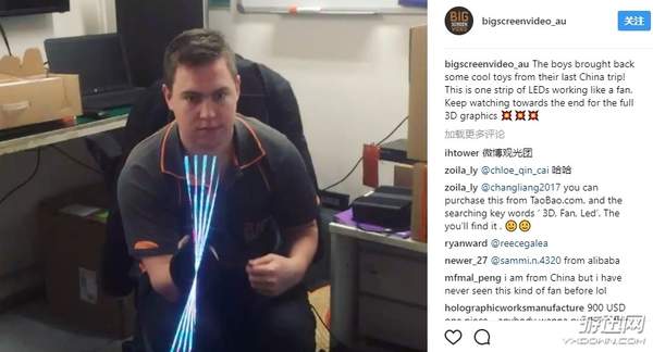 该博主表示:“这位国外小哥在上次的中国之行中,带回来一样超酷的玩具,这式一款像风扇一样转动的LED灯带。”