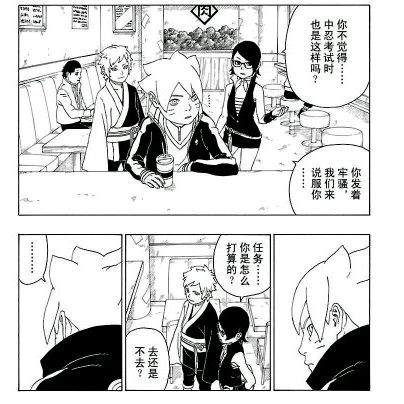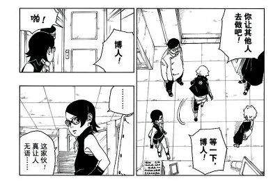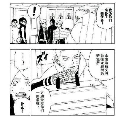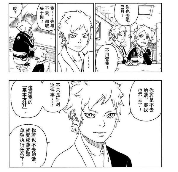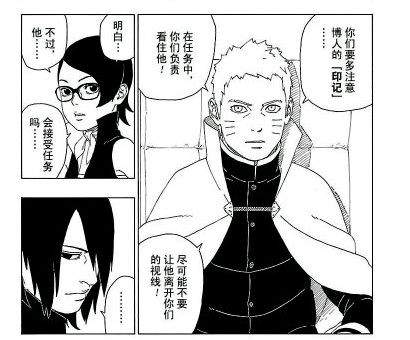 之后鸣人让博人、莎拉娜和巳月接受护送科学忍具义肢和方助去研究所,博人还在气头上表示不会接受这个任务,独自先离开了。之后鸣人佐助让莎拉娜和巳月在执行任务的时候多多注意博人手上的印记。