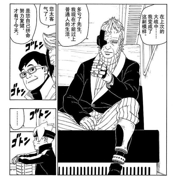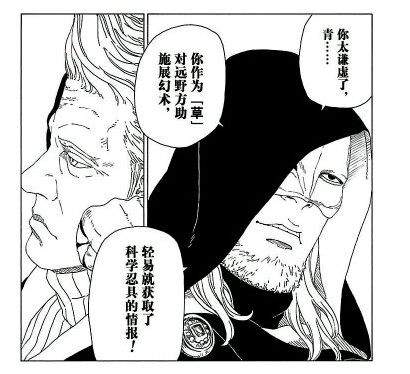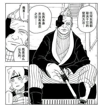 这个熟人居然是雾隐村的青,在之前的大战中大家都以为青已经阵亡了,现在他再次出现还成了方助的熟人。青的身体有不少部位已经被义肢替换,方助就是他的医师。博人面对这位曾经的忍者提出了科学忍具是否应该出现的疑问,青告诉他任何东西本身没有善恶之分,好坏要取决于如何使用。