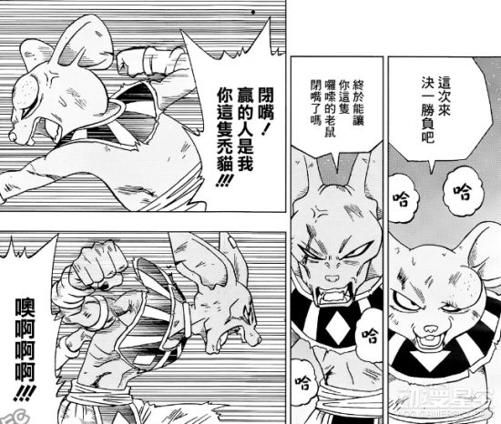 众多破坏神像街头斗殴一样不分敌我乱打一气,作为观众的全王感到非常无聊。此时,擂台上仅存的破坏神为第七宇宙的比鲁斯和第四宇宙的奎特拉,就在猫鼠大战即将进入最终局的白热化时,大神官突然阻止了他们的拳头。