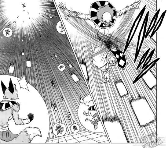第十一宇宙的小丑破坏神贝鲁摩德露出凶残的本性,他将破坏神们囚禁起来,并飞到空中抛掷锋利的卡牌实施进攻。见此情形,第八宇宙的狐狸利吉尔也不遑多让,他变化为九尾狐的造型,对得意洋洋的贝鲁摩德猛烈轰炸。
