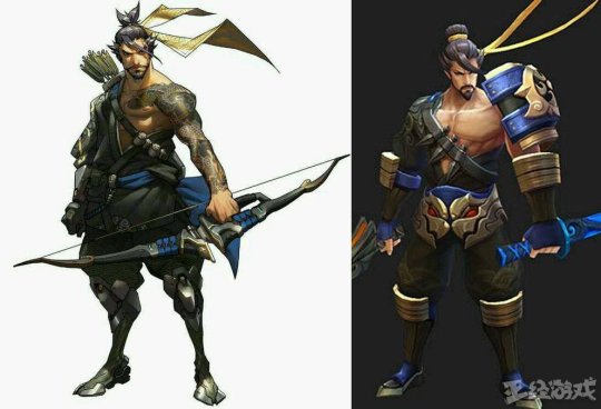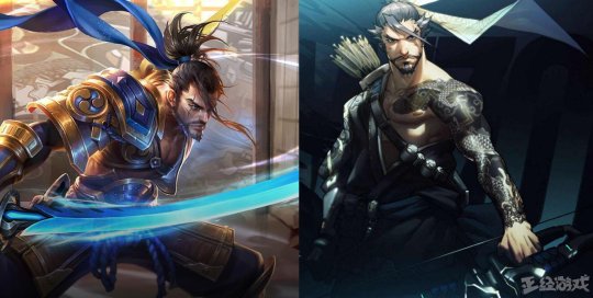 如飘逸的发带,额前一缕头发,胸前的斜背带,重点是两位都露胸!为数不多的区别就是《守望先锋》的半藏用的是弓箭,《王者荣耀》的武藏是用刀,前者姓岛田,后者则姓宫本。
