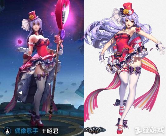 韩国有一款叫《Chaos OL》的网游里一位叫Herjuna角色,这个角色的一款皮肤和王昭君旧款的“偶像歌手”皮肤十分相似。同样的黄花高礼帽,露肩红色小礼服,紫色蝴蝶结加白色长筒袜,还有就是人家这款游戏也是MOBA游戏……