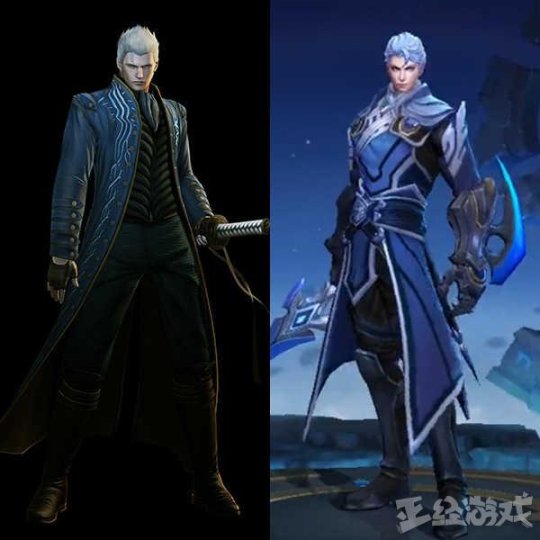 《王者荣耀》里铠是出生自魔道家族,月光之女露娜的兄长,能从虚空中召唤铠甲。凯的外形特点是大背头,银发,蓝袍,长剑。这造型和经典动作游戏《鬼泣》中但丁的哥哥维吉尔十分的相似,而且两人的背景也差不多,都是魔族少年,兄长的身份。
