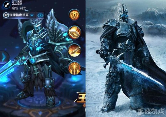 这样的造型和《魔兽世界》里大名鼎鼎的巫妖王可以说是一个模子印出来的了,发光的眼睛,膝盖处的骷髅装饰,腿上缠的皮毛,连剑锷都一个造型……而且大概是身上的盔甲太重吧,亚瑟也和巫妖王一样被压成了小短腿。或许是天美在向魔兽世界致敬吧。