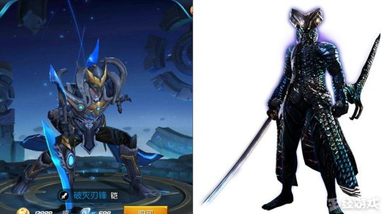 历史上宫本武藏是日本战国末期江户时代初的剑术大师,《王者荣耀》里的宫本武藏的造型是蓝黑配色,缎带缠发,留着一圈小胡子,上身只穿一半露出诱人的胸肌,这样的设计基本上和《守望先锋》里的半藏一模一样了。大概是因为两个角色都是以历史上的宫本武藏为原型的原因吧,所以两者不止是整体上的相似,就连很多细节都雷同了。