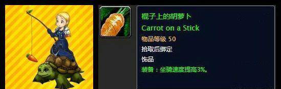这是60年代唯一一个加坐骑移速的饰品,在WOW的历史上它绝对是一个经典,再加上手套+3% 和马刺+5%,总速度能达到111%,要知道在那个年代可没有飞行,骑马跑路是家常便饭,所以胡萝卜也成了无法遗忘的经典。