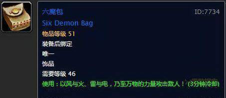 六魔包的经典相信大家已经听过很多次了,以风与火、雷与电,乃至万物的力量攻击敌人!共有9种效果,涵盖伤害、控制、召唤!要知道当年它可是有100%法伤的加成,它曾经是辉煌的存在,著名插件六魔包也是以此命名。