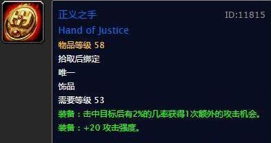 这可是60年代红极一时的经典装备,基本上是所有物理系职业的梦想以及必备的饰品之一,为了它可以把黑石深渊(抢驻新服)刷上一万遍啊一万遍......甚至很多人进了NAXX都没换下来它!而又有多少人直接一个正义之手带遍了整个60年代......