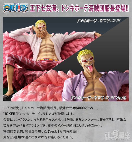 《海贼王》中的唐吉诃德·多弗朗明哥是一个极其拉风的角色,他是“王下七武海”之一,也是势力最庞大的七武海。他私下里还经营着非法的人类拍卖所,绑架各种族生物。暗中圈养着邪恶科学家凯撒·库朗,生产人造动物系恶魔果实,并背着海军政府私下将人造果实卖给四皇凯多。可以说他是一个非常邪恶的存在但是也是非常的有人气。万代在多弗朗明哥生日(10月23日)这天,专门推出了他的限定版手办,并且公开了实物图。