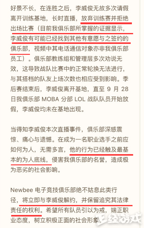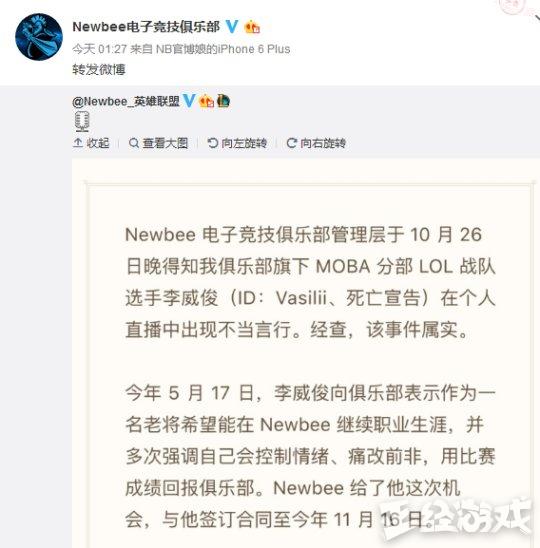 事情发生后,今日凌晨,死亡宣告所效力的Newbee俱乐部英雄联盟分部发布微博证实死亡宣告打人之事,并列举死亡宣告(李威俊)在俱乐部的糟糕表现,宣布死亡宣告的做法触及到最基本的做人底线,将立即与死亡宣告解约。