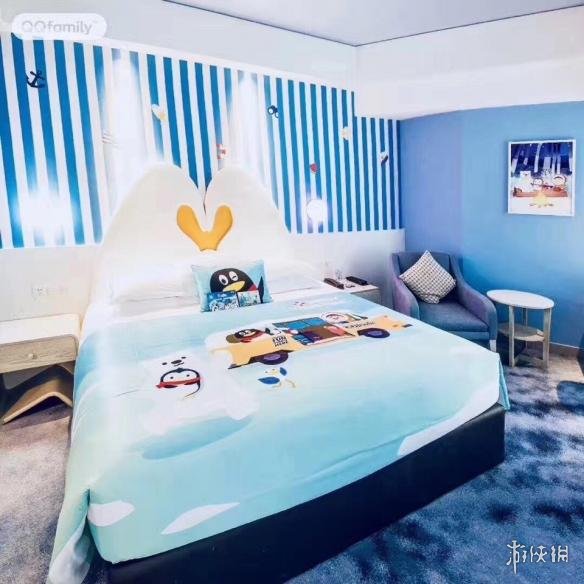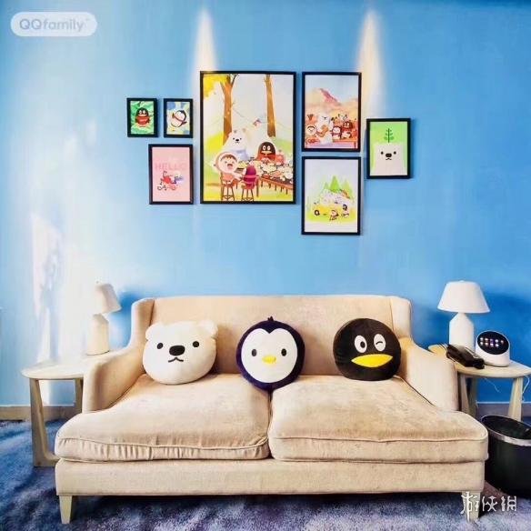 房间整体使用了蓝色调的设计,沙发上的QQfamily十分呆萌可爱。