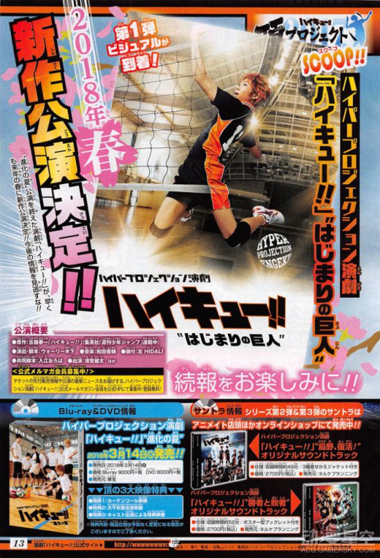 《排球少年》将在2018年春推出新篇章“小巨人”的真人舞台剧。由须贺健太主演,音乐担当:和田俊辅。