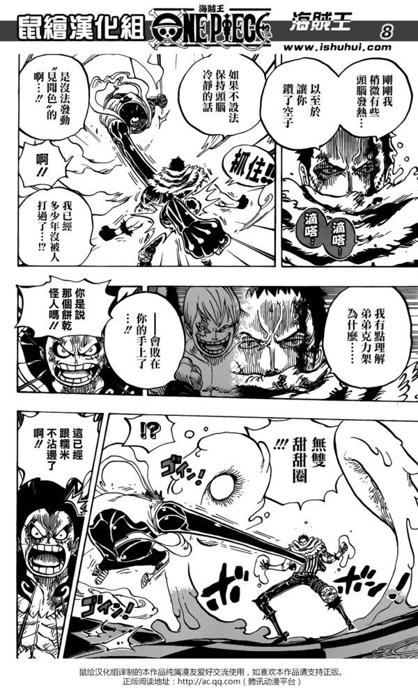 《海贼王》漫画884话汉化版已正式更新,四档路飞卡塔库栗正式开打,但卡塔库栗还是更胜一筹,直接一拳KO了路飞。在巧克力岛上,山治和布琳正在拼命做蛋糕,而在海上普拉利涅魅惑的歌声迷惑了所有的海蛞蝓,感觉场面真是一片混乱啊。