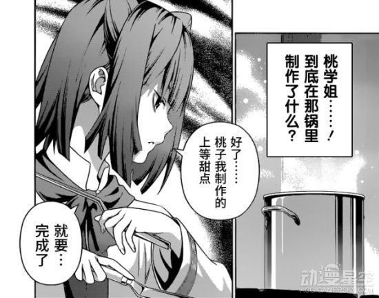 尽管茜久保桃的料理还未正式出锅,但从里面散发出的香气却将黑化的川岛丽瞬间洗白,在观众们的惊呼中小桃学姐从容不迫完成了自己料理的最后一道工序,她十分迅速地持刀对锅里的东西装饰起来。