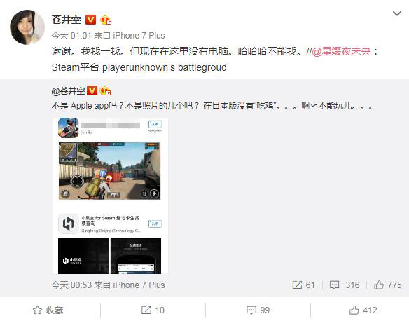 这股潮流甚至还惊动了一向热爱中国文化的日本著名爱情动作女演员苍井空老师。昨日凌晨,苍老师发布了一条微博说道“不是Apple APP吗?不是照片的几个吧?在日本没有"吃鸡"...啊~不能玩儿...”同时配上了一张某“大逃杀”类型手游的应用上商店截图。