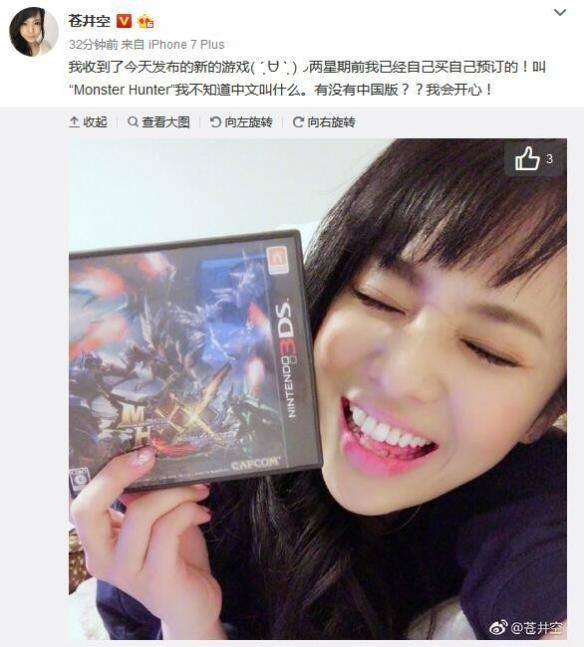 其实苍老师在业余生活中一直都是个喜欢电子游戏的妹子,卡普空《怪物猎人XX》发售时苍老师就曾晒出过照片,后来甚至还因为用力过猛而弄断了3DS的摇杆。