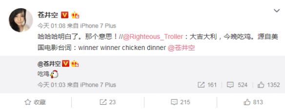 而在得知后吃鸡的原意为Winner winner chicken dinner后苍老师又高兴的回复到:“哈哈哈明白了!这个意思。”