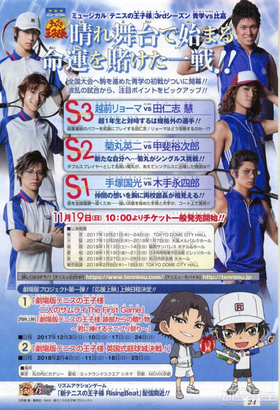 《网球王子》真人舞台剧定于17年12月开始持续到18年2月将在日本全国巡回公演。故事剧情为全国大赛青学对战嘉中。