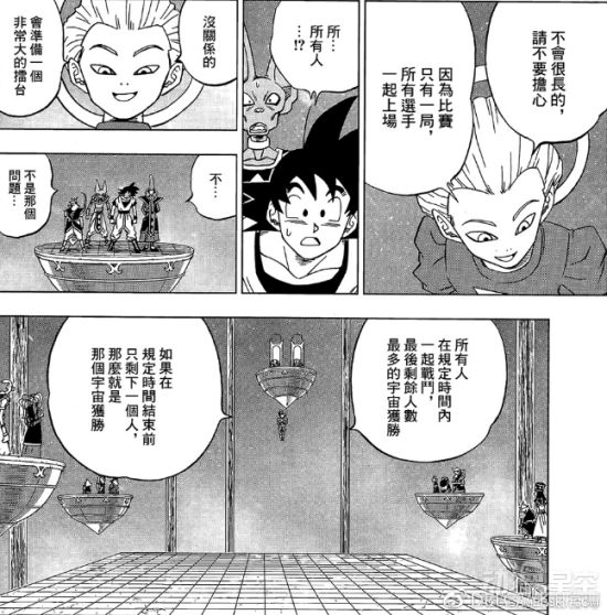 悟空与托破的战斗结束,双方各自回到观众席上听候大神官的指示。根据大神官的介绍,力之大会将从每个宇宙选拔出10位强力战士(破坏神除外)作为参赛选手,只要把对手从擂台上击落便视为获胜,时间限制48分钟。