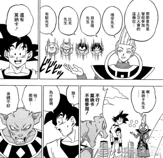 地球上,比鲁斯等人大快朵颐吃着美食,此时挺着大肚子的布尔玛出现了。为让贝吉塔安心参赛,维斯使用能力令怀孕的布尔玛顺利分娩,夫妻俩的女儿瞬间诞生,了却了一桩心事。讨论期间,大家相继列举出悟空、贝吉塔、比克、布欧、悟饭、龟仙人、天津饭、克林、18号和17号,当然悟空也没有忘记第七宇宙“最强”的莫纳卡……