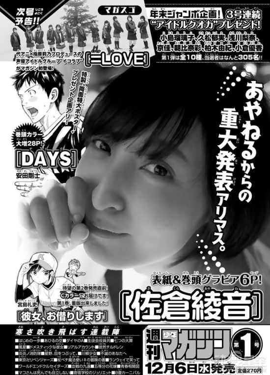 《周刊少年MAGAZINE》结尾宣布,人气声优佐仓绫音将于12月6日发行的《周刊少年MAGAZINE》2018年第1号公布重大消息。此外,她还等将登上当期杂志的封面以及多达6页的卷头彩页。