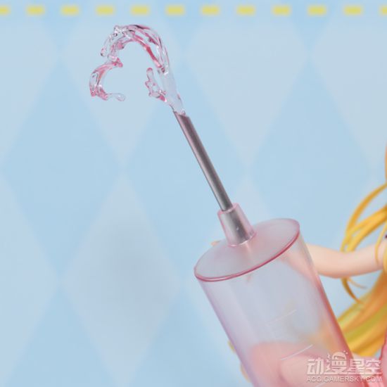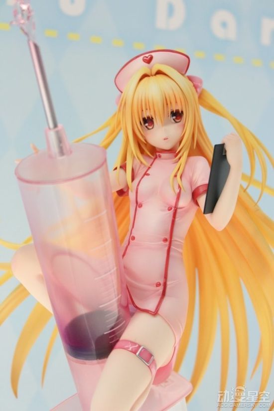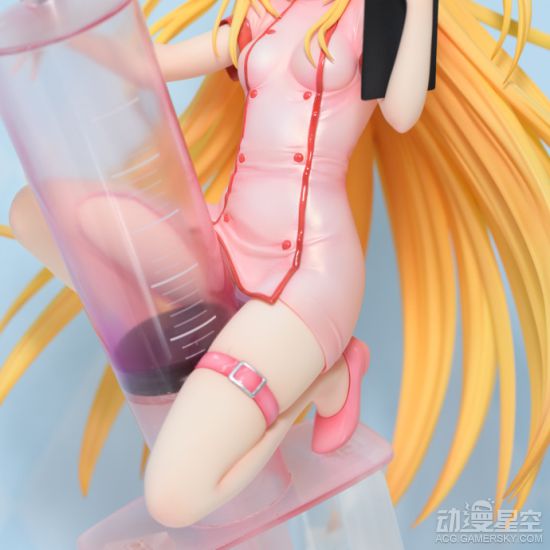 整体桃红色系,配合小暗本身的金色长发,给人感觉想当养眼。本体半蹲在一只放大数倍的等身粉色针筒上,在针尖部位有些许喷射粗的液体进行点缀,使得整提感觉更加生动。