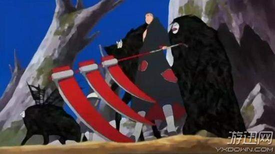 晓组织飞段的持有武器,拥有伸缩功能,底部由绳子连接住,并延伸到飞段腰部的缠绳环,并借由绳子的伸缩,使得飞段能够轻易的扔掷大镰刀,那三段刀锋的设计,就是为了使镰刀更能够伤害到对手,借由刀锋上的血,施展令人惧怕的诅咒术。